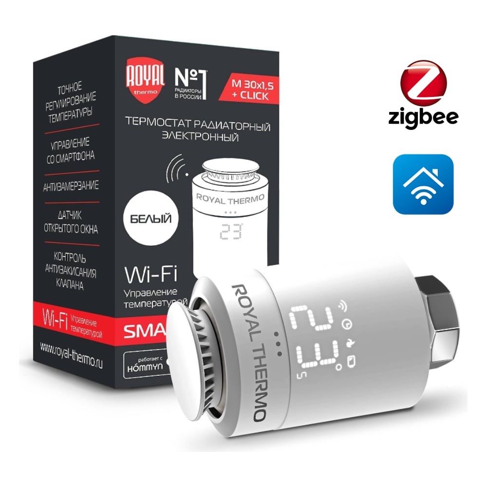 Термостат радиаторный электронный ROYAL THERMO Smart Heat с LED дисплеем и регулятором температуры.Назначение - регулировка температуры в комнате, при этом с возможностью управления теплом со смартфона через мобильное приложение. Необходимо подключить термостат к Zigbee хабу из Установочного Комплекта, использовать мобильное приложение HOMMYN.Режим Антизамерзание. Клапан будет открыт автоматически при температуре ниже 5°C. Когда температура повысится до 8°C, клапан будет закрыт.Режим Антизакисание. Функция включается на 30 секунд, на дисплее будет отображен идикатор «А5». По окончании работы термостат работает в обычном режиме.Режим Родительский контроль. Используйте длительное нажатие кнопки регулятора температуры, пока дисплей не покажет «LC». Для разблокировки так же используйте длительное нажатие кнопки регулятора температуры более 10 секунд.Контроль заряда элементов питания. Когда заряд элементов питания очень низкий, отобразится символ напоминающий, что пользователю пора заменить элементы питания.Контроль открытого окна. При открытии окна, когда включен радиатор отопления, при падении комнатной температуры на 6°C за 4 минуты, термостат закрывает клапан автоматически, дисплей покажет «0Р». При закрытии окна и повышении комнатной температуры на 2°C, термостат автоматически откроет клапан и будет работать в обычном режиме работы.Подключение отопительных приборов - M30x1,5мм, Danfoss Click Диапазон передачи сигнала беспроводной сети - 10м.