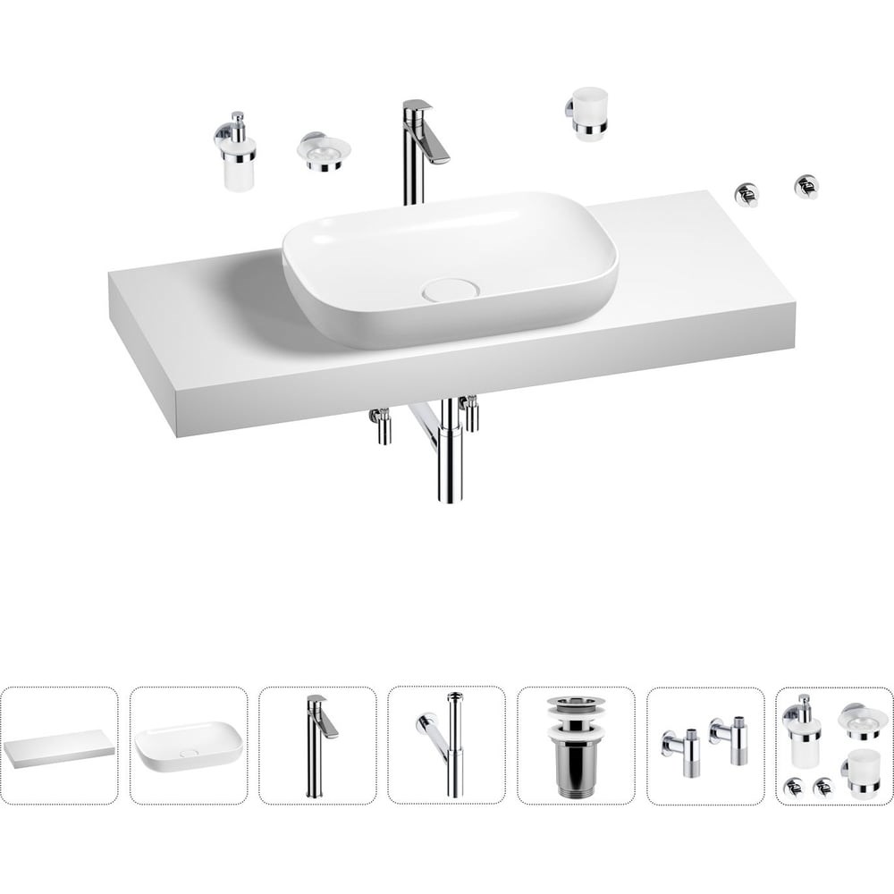 Комплексное предложение по специальной цене от Wellsee. СТОЛЕШНИЦА Основа столешницы из дерева Genuine Tree – высококачественная импрегнированная плита МДФ, пропитанная специальным составом для усиления стойкости материала и максимальной защиты от влаги, перепадов температур, грибка и плесени. Последующая многоступенчатая отделка поверхности сопровождается нанесением водоотталкивающей эмали и специального защитного покрытия TotalCover® для максимальной устойчивости к влаге и потенциальным химическим обработкам изделия в процессе уборки ванной комнаты. РАКОВИНА Тонкостенная накладная раковина Wellsee Croquis станет лаконичным завершающим штрихом интерьерного пространства ванной комнаты. Наличие керамического клапана на слив деликатно подчеркнет эстетику умывальной зоны, а элегантный белый цвет добавит света и воздушности внутренней отделке санузла. СМЕСИТЕЛЬ Надежный латунный смеситель с испанским картриджем 35 мм обеспечивает высокую точность управления напором и температурой воды, благодаря которому наслаждаться плавным скольжением ручки и мягким ходом смесителя можно более 10 лет. Регулируемый аэратор Neoperl с технологией AIRflow² позволяет скорректировать направление потока, уменьшает разбрызгивание и приглушает шум воды. ВАННАЯ КОМНАТА В СТИЛЕ WELLSEE Завершить современный интерьер ванной комнаты можно с помощью сифона, донного клапана, угловых вентилей (2 шт), набора аксессуаров (5 шт) и элегантными зеркалами 7 Rays' Spectrum.