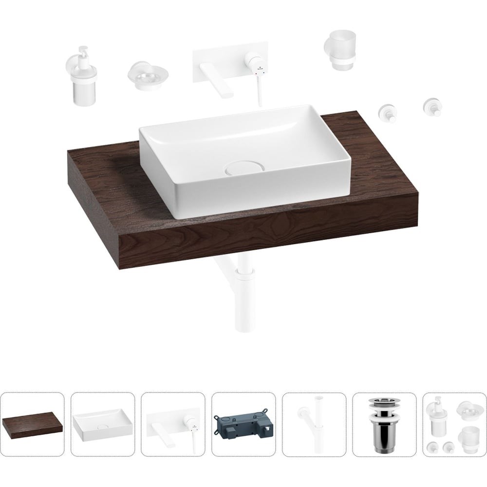 Комплексное предложение по специальной цене от Wellsee. СТОЛЕШНИЦА Основа столешницы из дерева Genuine Tree – высококачественная импрегнированная плита МДФ, пропитанная специальным составом для усиления стойкости материала и максимальной защиты от влаги, перепадов температур, грибка и плесени. Максимальная влагостойкость достигается за счет укрепления торцов изделия массивом дерева. Далее поверхность столешницы покрывается натуральным шпоном и дополнительно обрабатывается бейцем, что позволяет получать уникальную для каждого покупателя текстуру и выразительный цвет. РАКОВИНА Накладная раковина Pure BY Wellsee с первого взгляда покоряет своей чистотой и безукоризненностью линий. Изысканные формы и внешняя хрупкость конструкции смягчат самый неординарный интерьер ванной комнаты. Наличие керамического клапана на слив деликатно подчеркнет эстетику умывальной зоны. СМЕСИТЕЛЬ Надежный латунный смеситель с испанским картриджем 35 мм обеспечивает высокую точность управления напором и температурой воды, благодаря которому наслаждаться плавным скольжением ручки и мягким ходом смесителя можно более 10 лет. Регулируемый аэратор Neoperl с технологией AIRflow² позволяет скорректировать направление потока, уменьшает разбрызгивание и приглушает шум воды. ВАННАЯ КОМНАТА В СТИЛЕ WELLSEE Завершить современный интерьер ванной комнаты можно с помощью сифона, донного клапана, угловых вентилей (2 шт), набора аксессуаров (5 шт) и элегантными зеркалами 7 Rays' Spectrum.