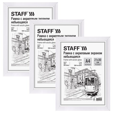Рамка 21х30 см небьющаяся, КОМПЛЕКТ 3 шт., багет 17 мм МДФ, STAFF "Carven", белая, 391325