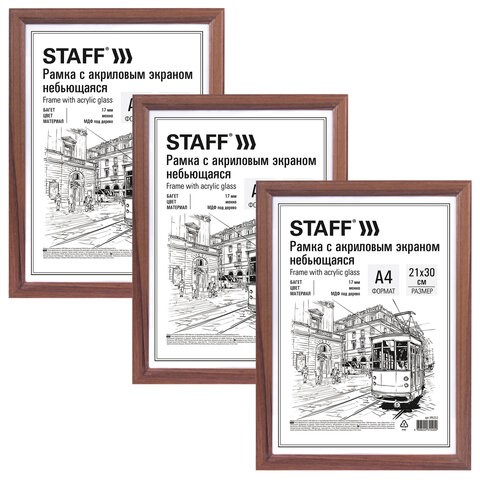 Рамка 21х30 см небьющаяся, КОМПЛЕКТ 3 шт., багет 17 мм МДФ, STAFF "Carven", цвет мокко, 391322