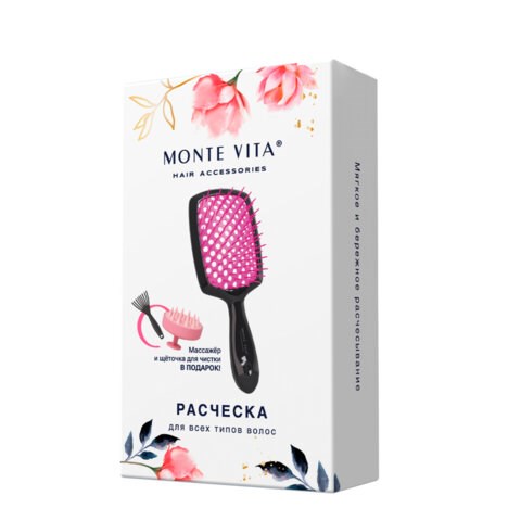 Расческа для волос массажная 20х8,5 см, массажер и щетка для чистки В ПОДАРОК, черная/розовая, MONTE VITA (МОНТЕ ВИТА), 457430