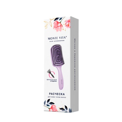Расческа для волос массажная, 24x7,5 см, с натуральной щетиной + щетка для чистки В ПОДАРОК, MONTE VITA (МОНТЕ ВИТА), 457432