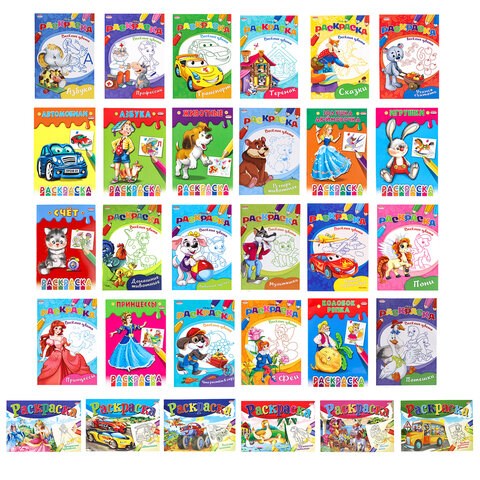 Комплект состоит из 30 раскрасок разных сюжетов без возможности выбора сюжетов!