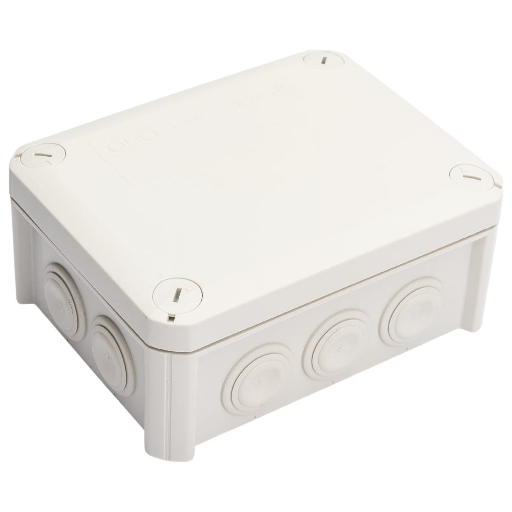 Кабельная распределительная коробка для соединения кабелей и проводов в помещении и в защищенных зонах вне помещения. Прямоугольная форма с вставными уплотнениями по бокам и штамповкой под отверстия на дне. Подходит для настенного и потолочного монтажа и