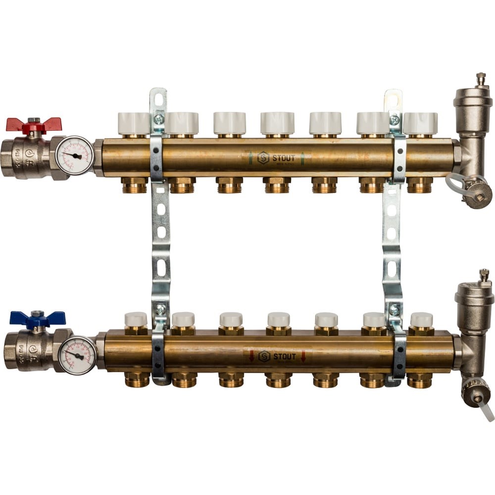 Распределительный коллектор из латуни без расходомеров 7 вых. STOUT SMB 0468 000007 - отличное решение для организации отопительной системы или теплого пола в квартире, частном доме, коттедже. Преимуществами данного устройства являются равномерное распространение тепла по всем компонентам системы, возможность регулировки температуры и отключения какой-либо ветви. Использование коллектора существенно повышает эффективность системы отопления и обеспечивает ее ремонтопригодность.