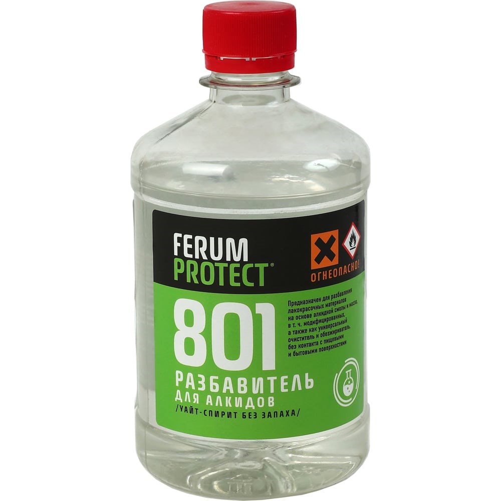 Растворитель (уайт-спирит) Ferumprotect 801 для алкидов, 1 л ТД000004350 предназначен для разбавления лакокрасочных материалов на основе алкидной смолы и масла, в т. ч. модифицированных, а также как универсальный очиститель и обезжириватель, без контакта с пищевыми и бытовыми поверхностями. Применять в строгом соответствии с рекомендациями и техническими инструкциями на соответствующие лакокрасочные материалы, использовать только после проверки на совместимость с каждой конкретной партией.