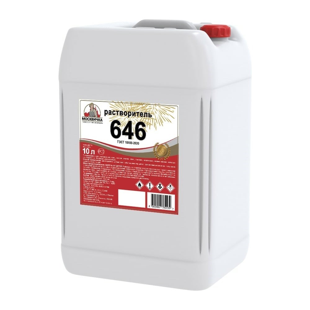 Растворитель № 646 Москвичка 10 л 4620105771597 представляет собой смесь нескольких: бутилацетат, этилцеллюлоза, ацетон, толуол с бутиловым и этиловым спиртом. Применяют преимущественно для лакокрасочных материалов на нитроцеллюлозной основе, а также автоэмалей МЛ и КО. Его отлично разбавляют грунтовки НЦ, ЭП, МЧ, МС, шпатлёвки НЦ и ЭП. Другое назначение этого растворителя - обезжиривание металлической поверхности перед окрашиванием. Еще одно свойство растворителя 646 - возможность обработки инструментов после окрашивания. Для того, чтобы использовать растворитель 646 для проведения покрасочных работ, не нужно обладать никакими специальными знаниями. Способ применения Разбавить материал до состояния, при котором его удобно наносить на поверхность, определяя консистенцию самостоятельно Ознакомиться с инструкцией к лакокрасочному материалу, который вы собираетесь использовать, обычно в ней указано количество растворителя, необходимое для разбавления