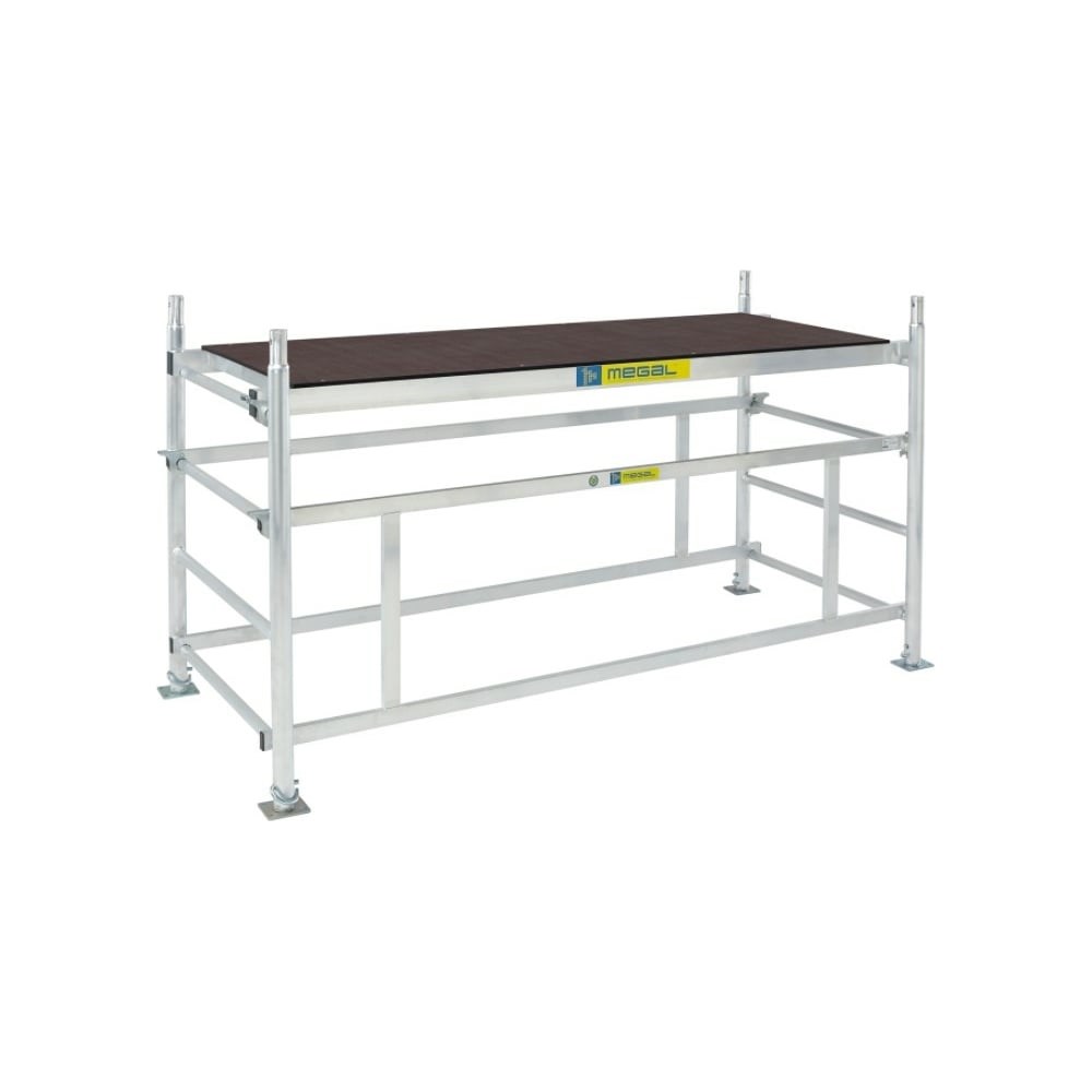 Подмости разборные алюминиевые MEGAL ПРА - 700 051302 предназначены для проведения различных работ на высоте до 3 м. Конструкционные элементы подмостей компактны при хранении, и позволяют проносить их в помещения, независимо от размеров дверных проемов, перевозить на багажнике легкового автомобиля. Быстрый монтаж и демонтаж без использования инструмента, облегченная конструкция узлов. Поверхность рабочей площадки - влагостойкая фанера с нескользящим покрытием, толщиной 9 мм (можно изменять высоту с шагом 0.27 м). Рамы установлены на нерегулируемые опоры.