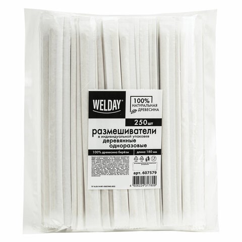 Размешиватель одноразовый деревянный в индивидуальной упаковке 180 мм, КОМПЛЕКТ 250 шт., WELDAY (ВЭЛДЭЙ), 607579, 97