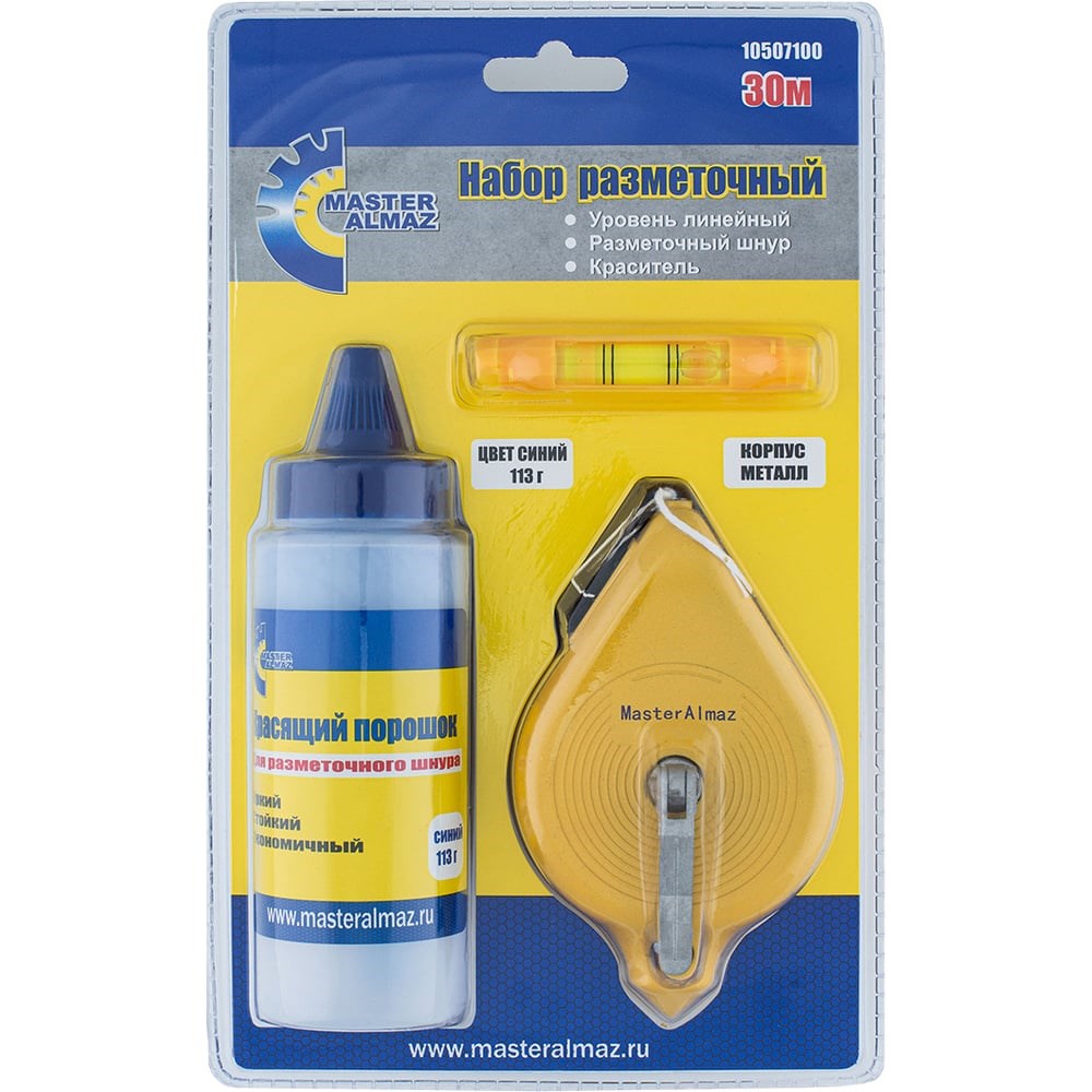 Разметочный набор МастерАлмаз 3 предмета, линейный уровень, разметочный тросик, краситель 10507100. При первичной заправке разметочного шнура рекомендуется сначала полностью вытянуть нить, и только после этого заполнить корпус наполовину или на 3/4 красящим составом. После чего он полностью готов к работе.