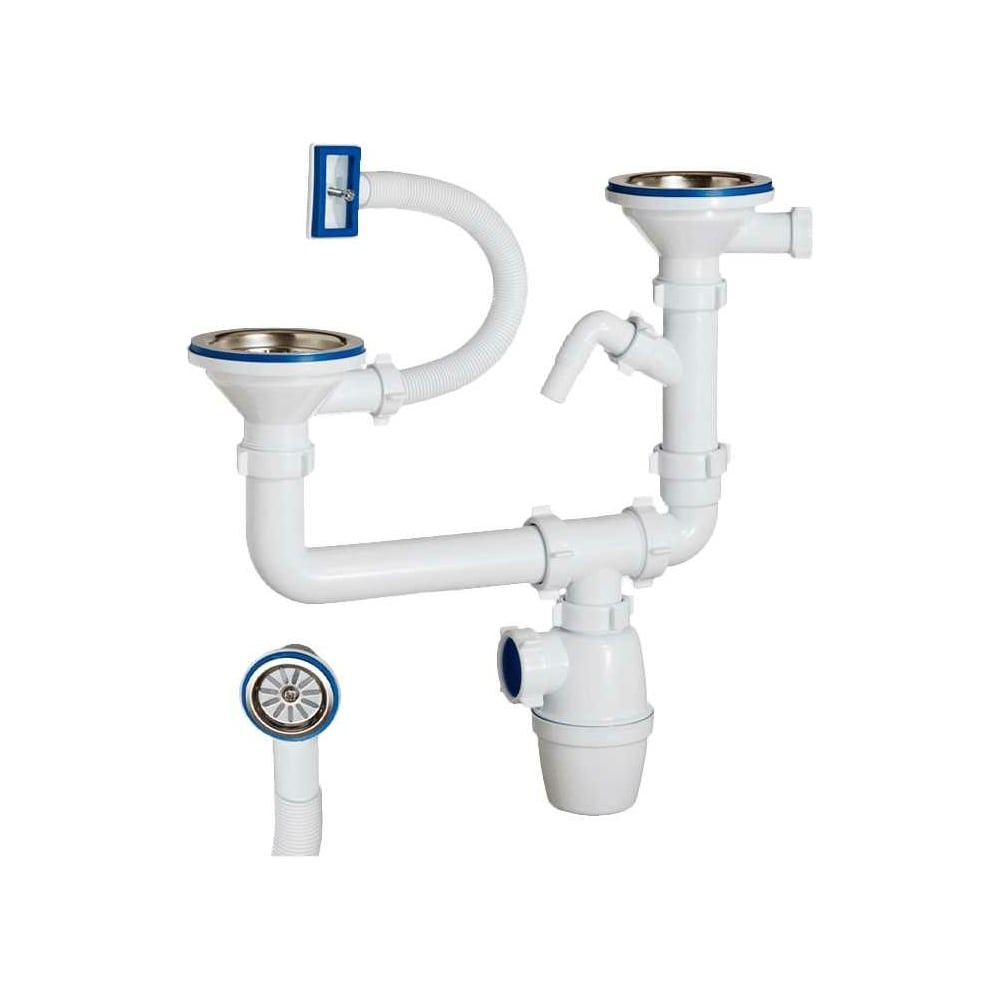 Двойной бутылочный сифон ORIO разноуровневый 3 1/2x40, с одним отводом и переливом универсальный перелив К-40093 с большим корпусом и отстойником, нержавеющими чашками 114мм для двойной разноуровневой мойки с круглым или прямоугольным переливом, одним отводом для слива от стиральной машины. В комплекте так же идут две прокладки на прямоугольный перелив – прямоугольная на квадратную форму мойки и полукруглая на круглую. Необходим отвод в канализацию.