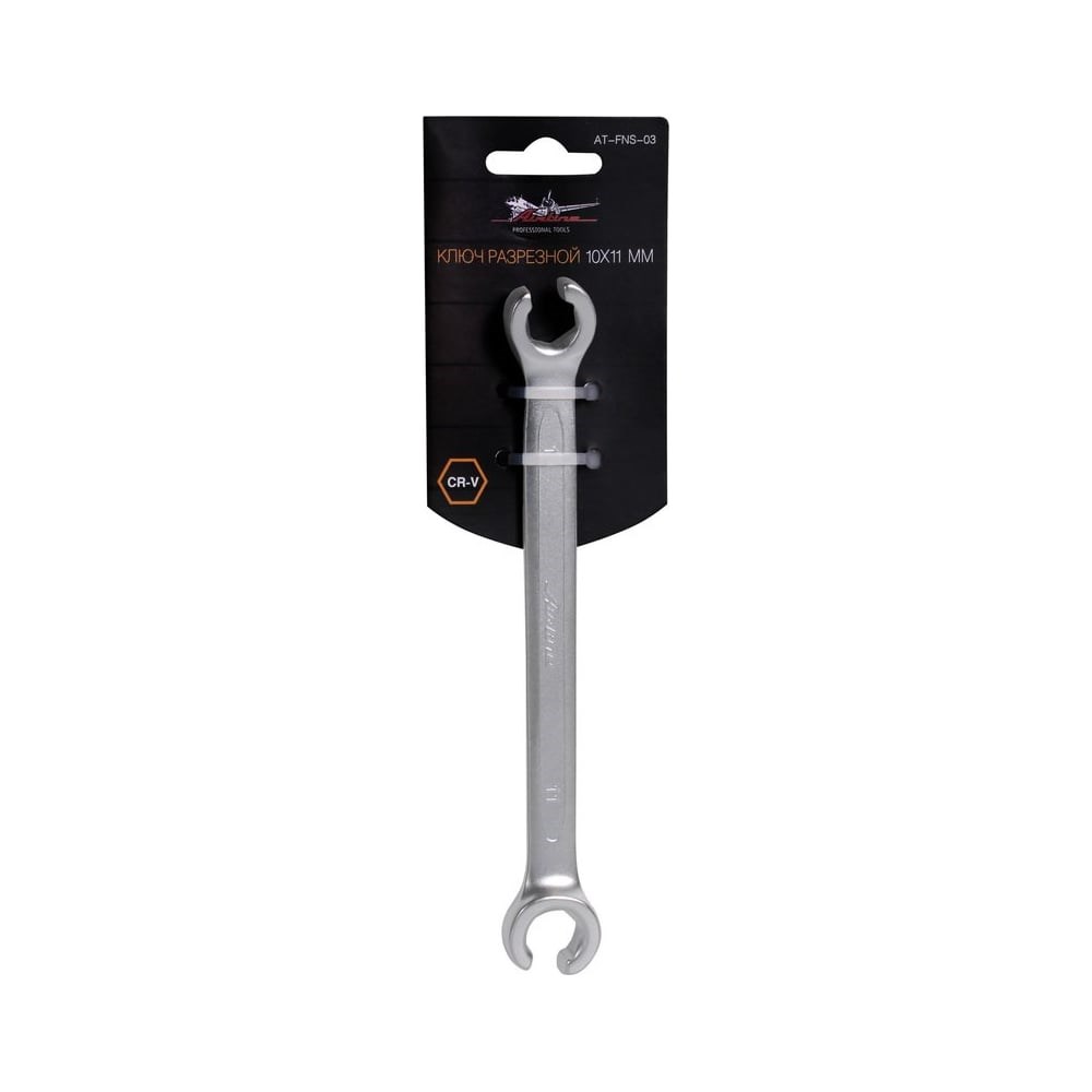 Разрезной ключ 10х11мм Airline AT-FNS-03 оснащен двумя головками. Инструмент выполнен из хромованадиевой стали методом горячей ковки. Профиль позволяет охватить большую площадь поверхности крепежа, что делает эксплуатацию более безопасной для граней. Твердость металла: 45-47 HRC.