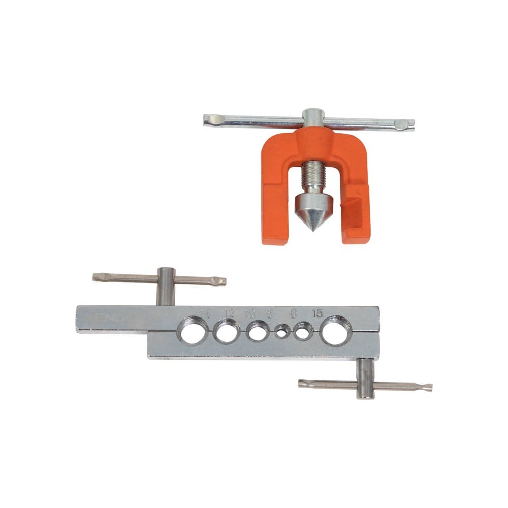 Развальцовка KENDO 50206 используется для гибки трубок из меди и алюминия. Корпус инструмента выполнен из прочного и качественного цинкового сплава, что обеспечивает надежность и долговечность. Развальцовка поддерживает гибку трубок диаметром от 8 до 15 мм. Изделие имеет простую надежную конструкцию для удобной работы.