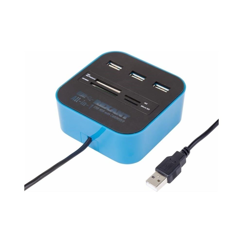 Разветвитель USB на 3 порта + картридер "Все в одном" черный REXANT 18-4121 - компактный и легкий многофункциональный хаб, который служит для возможности одновременного подключения нескольких устройств USB, например: компьютерной мыши, клавиатуры и мультимедийного джойстика, модема, роутера, жёсткого диска и флэш-накопителя, фотоаппарата, камеры, смартфона и планшета, принтера и пр.Дополнительно устройство оснащено разъемами для считывания данных со всех существующих карт памяти: SD, MicroSD, MS, M2. Изделие не требует внешнего питания, подходит для совместного использования с ноутбуками и стационарными компьютерами. Представленная модель разветвителя отличается высокой скоростью передачи данных.