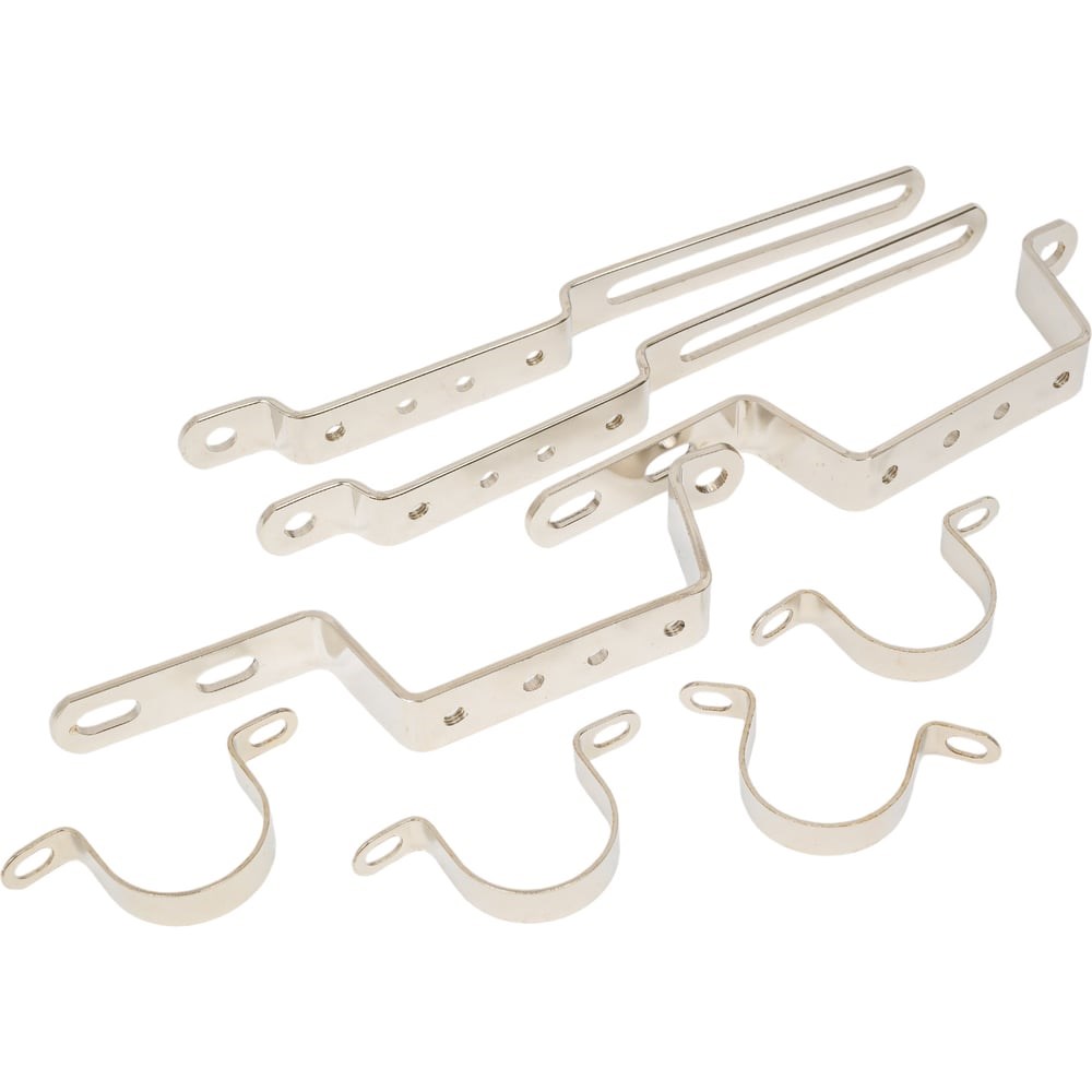 Кронштейн регулируемый для коллекторной группы ONDO пара OCRS2KG0 состоят из крепежной планки, выполненной из стальной анодированной полосы толщиной 3 мм, к которой винтами крепятся два стальных никелированных хомута толщиной 1 мм. В хомуты вставлены прокладки из эластомера, служащие тепло- и виброзащитой и предохраняющие коллекторы от механических повреждений. Кронштейны обеспечивают разнос коллекторов по высоте на 115 мм (между осями) и на 32 мм по глубине.