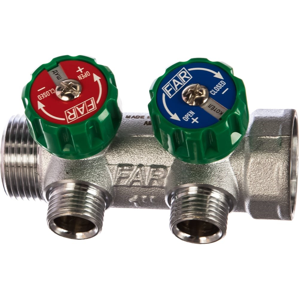 Регулирующий коллектор FAR 1" ВР-НР с 2 отв. 1/2" НР межосев. 45 мм FK 3821 112 предназначен для возможности распределения теплоносителя внутри системы отопления по разным контурам. Данная модель имеет два выхода.