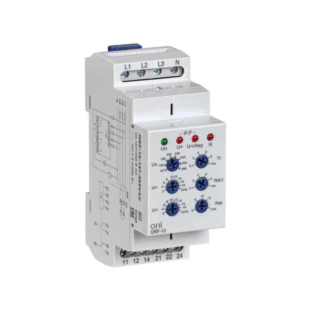 Реле контроля фаз ORF предназначены для контроля параметров трехфазной электрической сети (чередование фаз, обрыв фаз и нейтрали, асимметрия, повышенное и пониженное напряжение) и защиты чувствительных к этим параметрам потребителей. Реле осуществляет измерение напряжения на каждой фазе относительно нейтрали (L-N).