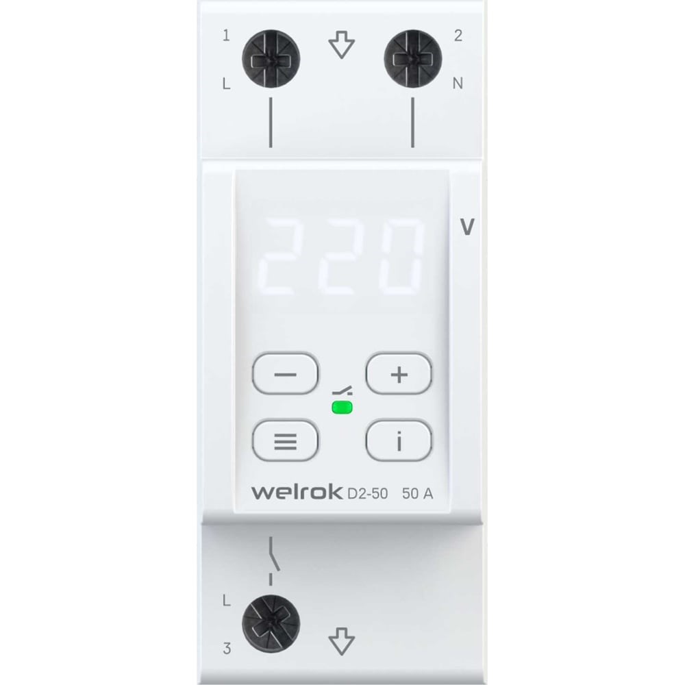 Реле напряжения Welrok d2-50 4660251140052 защищает оборудование от скачков и провалов напряжения, обрыва нулевого провода. Реле отключает нагрузку, если сетевое напряжение выходит за установленные пределы. Когда значение напряжения вернется в норму, нагрузка будет автоматически включена обратно. Welrok D2 - компактное реле на 2 модуля с мощным функционалом: Скорость срабатывания реле < 0,03 сек. TrueRMS для точного измерения напряжения. Для уменьшения количества срабатываний: Защита от частых срабатываний. Регулируемый гистерезис. Регулируемая задержка включения нагрузки. Профессиональная модель отключения при выходе напряжения за пределы. Для анализа питающей сети по характеру аварийных срабатываний: Журнал срабатываний на 100 значений. Для комфортной и безопасной эксплуатации: Поправка напряжения на экране. Регулировка яркости экрана. Защита от перегрева. Корпус реле напряжения изготовлен из пластика, не поддерживающего горение.