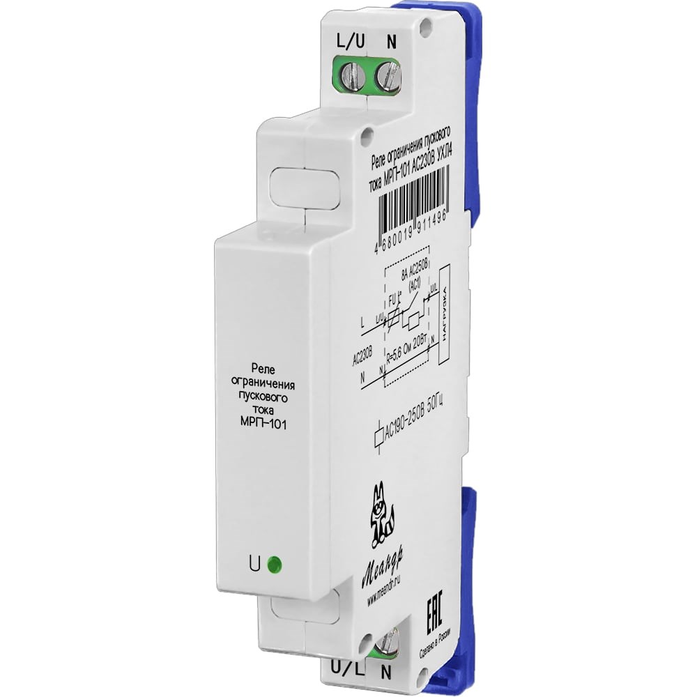 Реле ограничения пускового тока МРП-101 предназначено для уменьшения пусковых токов при включении емкостных нагрузок (например, импульсных блоков питания, драйверов LCD и т. д.). Снижение пускового тока осуществляется встроенным резистором с последующим замыканием резистора встроенным реле через некоторое время. Основные особенности: Ограничение пускового тока емкостных нагрузок до 30А Максимальная ёмкость нагрузки— 1500 мкФ Максимальный ток нагрузки— 8А Подключается ПЕРЕД выключателем и нагрузкой Ширина корпуса 13мм