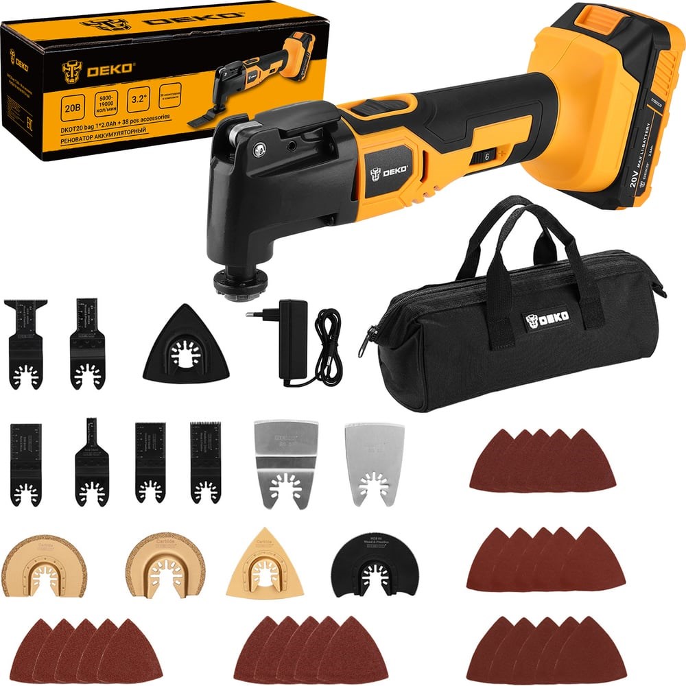 Реноватор DEKO DKOT20 идеально подходит для работы с такими материалами как дерево, металл. Хорошо подходит для обработки небольших участков, особенно углов и труднодоступных мест. Он незаменим как вспомогательный строительный инструмент на финальных этапах работы или при переделке. В комплект входит сумка, которая облегчает хранение и переноску инструмента и аксессуаров. Напряжение: 20 В Емкость аккумулятора: 2 Ач Частота колебаний: 5000-19000 кол/мин Угол колебаний: 3,2 Регулировка скорости: да Индикатор заряда батареи: да