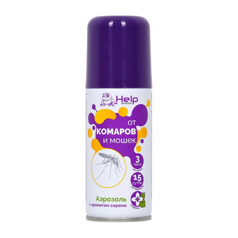 Репеллентный аэрозоль HELP Сирень, 75 мл 6 80218 защищает от комаров и мошек. Средство держится на коже до 3 часов, а на одежде - до 15 суток. Не содержит озоноразрушающих хладонов и не оставляет следов на одежде.