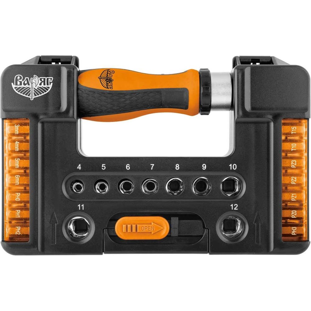 Хромованадиевая сталь. Намагниченный наконечник. Эргономичная обрезиненная противоскользящая рукоятка с реверсивным механизмом. Компактный пластмассовый кейс.
