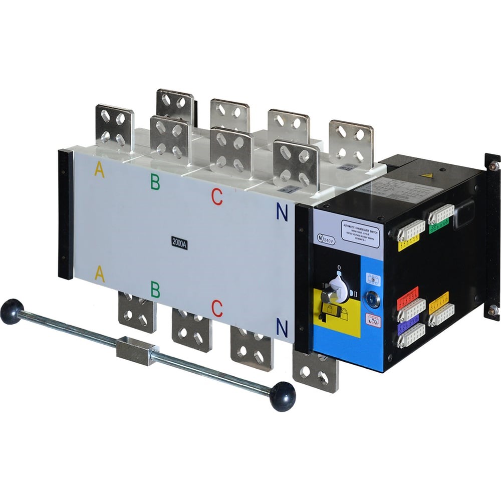Устройство автоматического ввода резерва ТСС SHIQ5-2000/4P 019362 с моторным приводом предназначен для автоматического переключения нагрузки между основным и резервным источниками питания по командам управления, приходящим от внешнего контроллера управления этими источниками (например, контроллера системы управления ДГУ). SHIQ5-2000/4P используют для сборки БЛОКА АВР электростанций мощностью 850кВт - 1000кВт, так же данный вид рубильника применяют в тех случаях, где необходимо бесперебойное питание - лечебные учреждения, торговые центры, крупные промышленные предприятия, нефте-газовая отрасль соответствующей мощности энергопотребления. SHIQ5-2000/4P предназначен для работы с внешним контроллером ввода резерва. Самый компактный вариант для своего номинального рабочего тока. Обладает высокой надёжностью благодаря долговечному покрытию контактов и прочному стальному механизму. Обеспечивает: Безыскровое переключение нагрузки. Полное отключение нагрузки (в «нулевом положении» рубильника). Возможность ручного переключения. Режим работы рубильника переключается установкой ключа рубильника в положение AUTO (автоматический) или MANUAL (ручной).