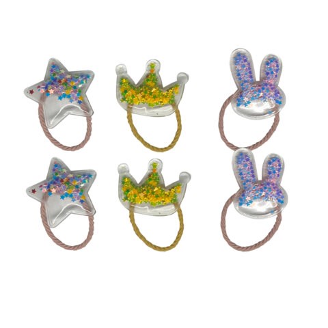 6 резинок с шармиками (звезды, короны, животные) — для тех, кто любит играть с образами. Яркие акценты делают их заметными, а тонкая основа (0,3?14 см) подходит для тонких волос.