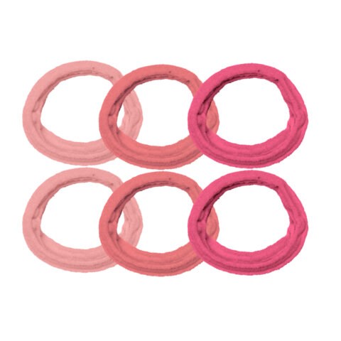 6 широких резинок (5 см) в пастельно-розовых тонах — идеально для густых волос. Плотная фиксация удерживает объемные пучки, а мягкие края защищают от повреждений.