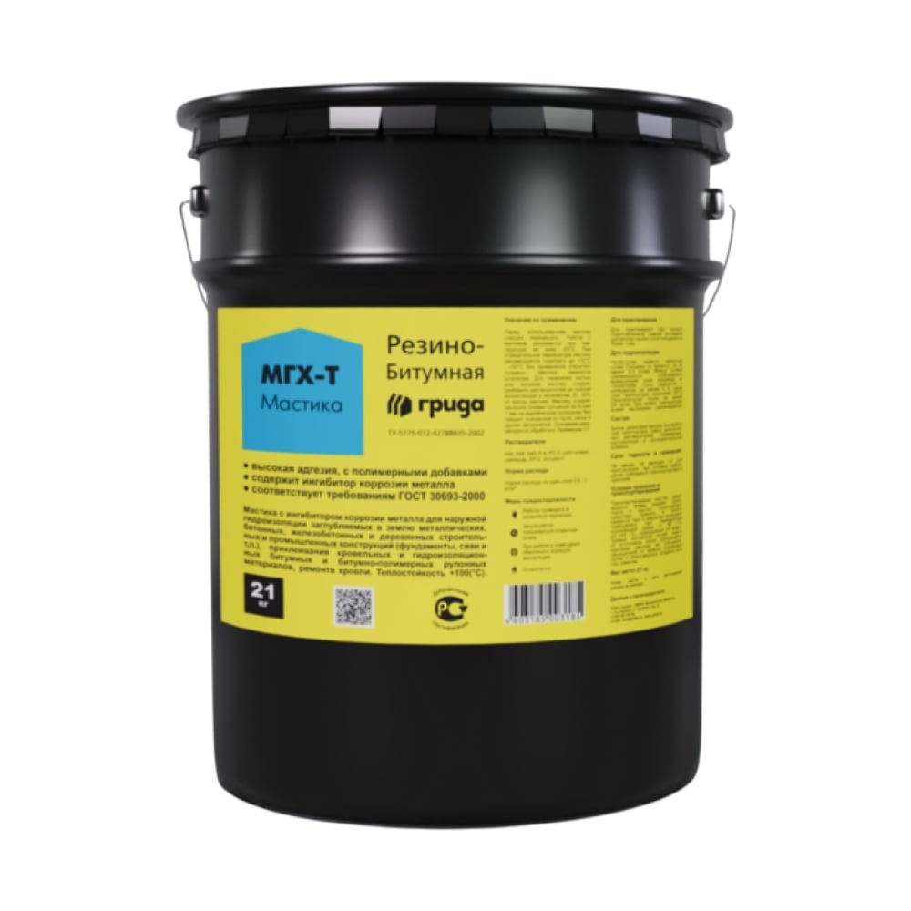 Резино - битумная мастика ГРИДА МГХ-Т 21 кг 206175 предназначена для приклеивания рулонных материалов, ремонта кровельных покрытий, внешней гидроизоляции строительных и промышленных конструкций.Материал характеризуется повышенной прочностью сцепления с металлом и бетоном, а также повышенной теплостойкостью. Его эксплуатация возможна в температурных режимах от - 50 до + 100 градусов.Обычно наносится шпателем, при нанесении кистью нужно разбавить растворителем в количестве 30–50 % от общей массы мастики. Распределять состав следует на сухую, предварительно очищенную (от песка, пыли и прочих загрязнений) и обработанную праймером "Грида" или же мастикой МГХ-Т (разбавить растворителем в соотношении 2:1) поверхность.Для приклеивания на хорошо подготовленное и ровное основание вполне достаточно слоя толщиной не более одного миллиметра.