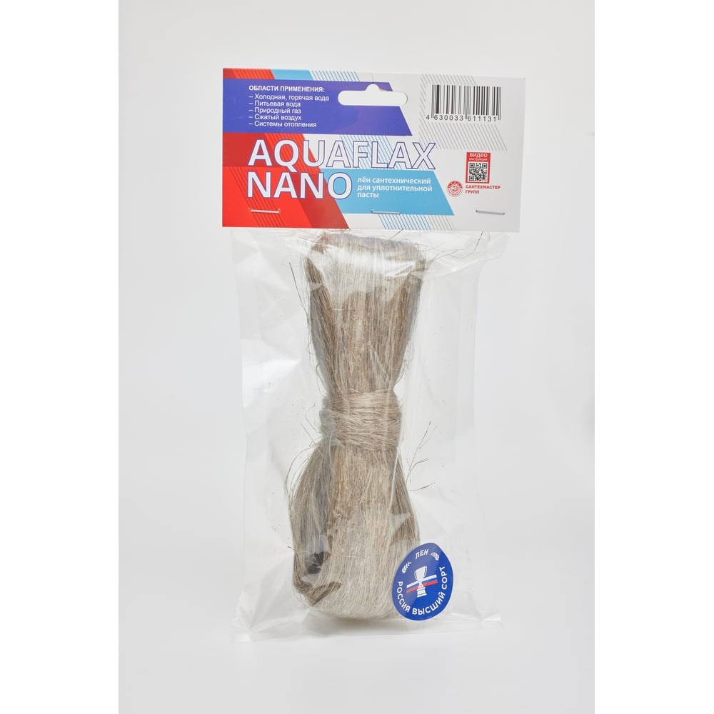 Сантехнический лён российский Aquaflax nano пакет, 50 грамм 04113 предназначен для герметизации резьбовых соединений различных систем. Применяется только совместно с уплотнительной пастой (рекомендуем использовать пасту того же бренда). Время герметизации: мгновенно Температура монтажа: без ограничений Рабочая температура: от - 60 до + 120°C Демонтаж: облегчённый ОБЛАСТИ ПРИМЕНЕНИЯ: природный газ холодная и горячая вода -системы отопления питьевая вода сжатый воздух