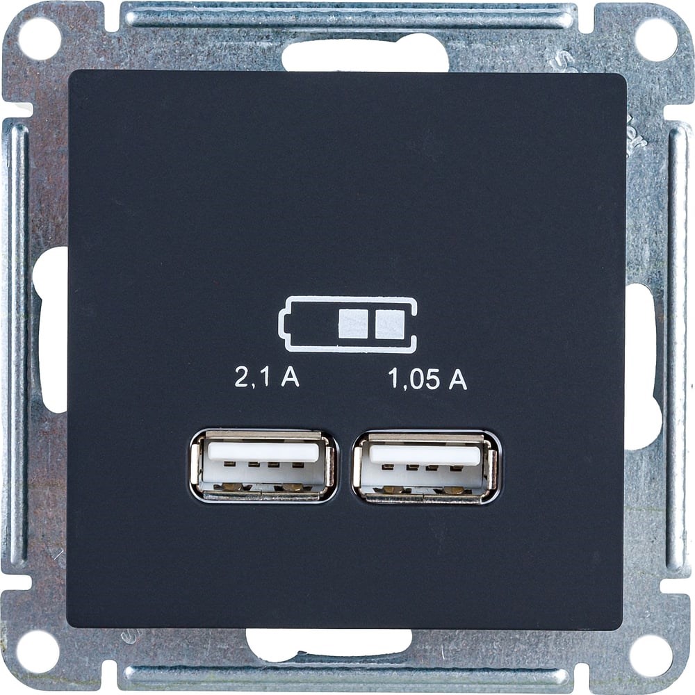 Механизм Systeme Electric (ранее Schneider Electric) серии AtlasDesign в цвете карбон розетки для зарядки с двумя разъёмами USB с выходными напряжением 5 В постоянного тока и выходами с номинальным током по 2,1 АUSB розетка позволяет напрямую заряжать одно или два мобильных устройствалицевые детали из качественного ABS-пластика, устойчивого к царапинам и УФ-излучениюусиленные прямые монтажные лапки для лучшей фиксации механизма в монтажной коробке