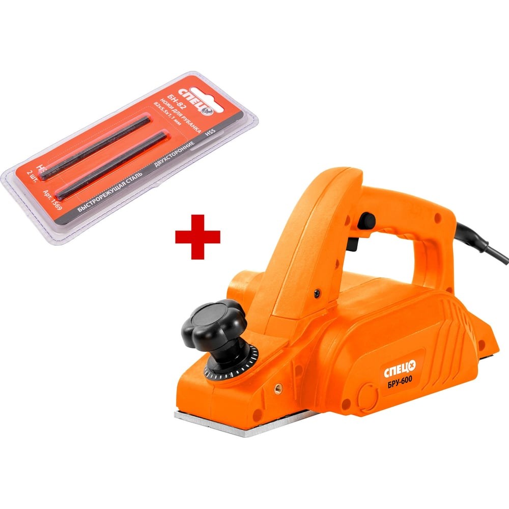 Рубанок СПЕЦ БРУ-600, 650Вт, ширина обработки 82 мм,выборка четверти, картонная упаковка + ножи для рубанка 82 мм СПЕЦ-2057/СПЕЦ-1569
