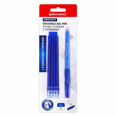 Ручка стираемая гелевая с эргономичным грипом + 9 стержней, BRAUBERG "RESTART", СИНЯЯ, игольчатый узел 0,7 мм, линия письма 0,35 мм, 144098