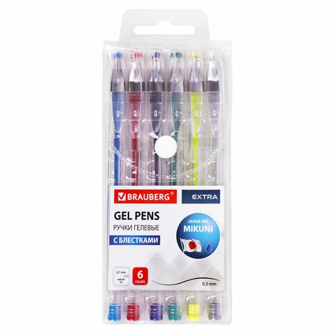 Ручки гелевые БЛЕСТКИ BRAUBERG "EXTRA", НАБОР 6 ЦВЕТОВ, узел 0,7 мм, линия 0,5 мм, 143908
