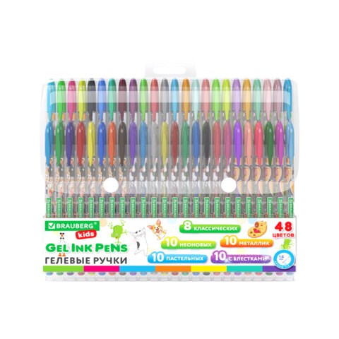 Набор включает 48 ручек с различными эффектами и цветами чернил: 8 ручек с классическими чернилами, 10 ручек с неоновыми оттенками, 10 ручек с эффектом металлик, 10 ручек с пастельными оттенками, 10 ручек с блестками. Разнообразная палитра открывает безграничные возможности для творчества и позволяет воплотить в жизнь даже самые нестандартные фантазии.