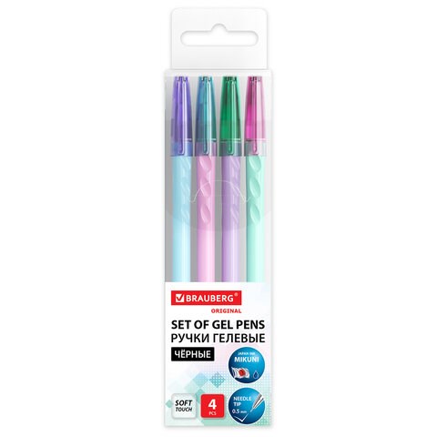 Ручки гелевые BRAUBERG ORIGINAL, ЧЕРНЫЕ, НАБОР 4 штуки, игольчатый узел 0,5 мм, линия письма 0,35 м, 144247