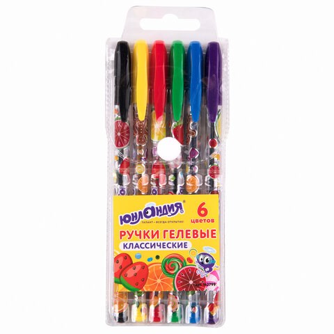Ручки гелевые ЮНЛАНДИЯ, НАБОР 6 ЦВЕТОВ, корпус с печатью, узел 0,5 мм, линия письма 0,35 мм, 142799