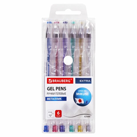 Ручки гелевые МЕТАЛЛИК BRAUBERG "EXTRA", НАБОР 6 ЦВЕТОВ, узел 0,7 мм, линия 0,5 мм, 143907