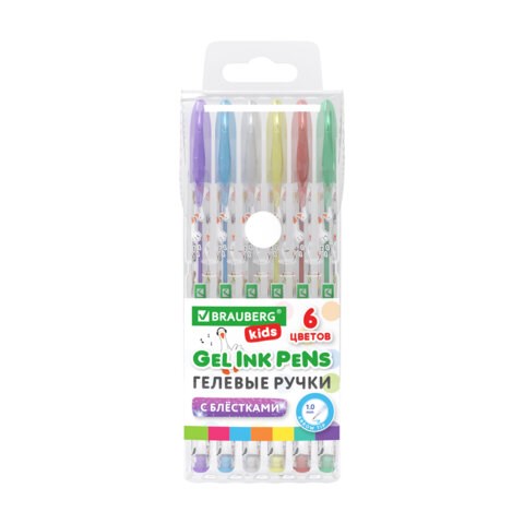Ручки гелевые С БЛЕСТКАМИ BRAUBERG KIDS "CUTE ANIMALS", НАБОР 6 ЦВЕТОВ, корпус с печатью, узел 1 мм, линия письма 0,7 мм, 144443