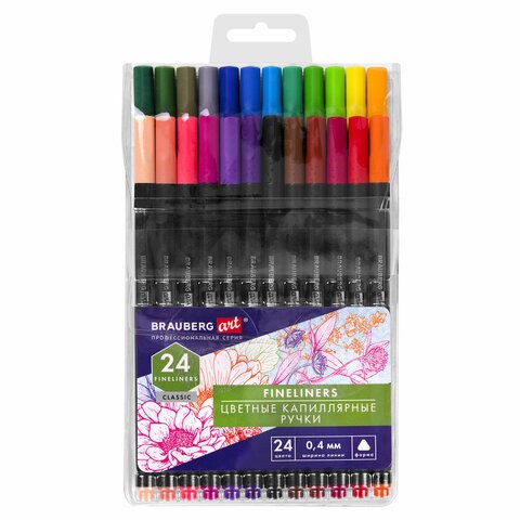 Набор капиллярных ручек BRAUBERG ART "Classic" состоит из 24 ярких цветов: красный, коричневый, синий, черный, желтый, лимонный, зеленый, розовый, голубой, сиреневый, фиолетовый, салатовый, оранжевый, светло-зеленый, темно-зеленый, малахитовый, бордовый, темно-синий, серый, бежевый, светло-бежевый, шоколадный, оливковый, светло-фиолетовый.