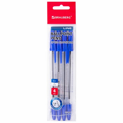 Ручки шариковые BRAUBERG, НАБОР 4 шт., СИНИЕ, "Line", узел 1 мм, линия письма 0,5 мм, 141099