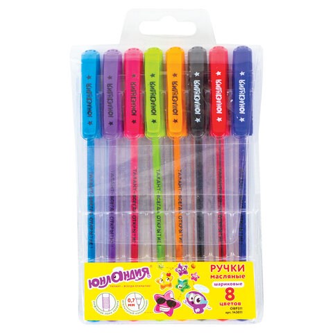 Ручки шариковые масляные ЮНЛАНДИЯ, НАБОР 8 шт., АССОРТИ, "STAR", узел 0,7 мм, линия письма 0,35 мм, 143011