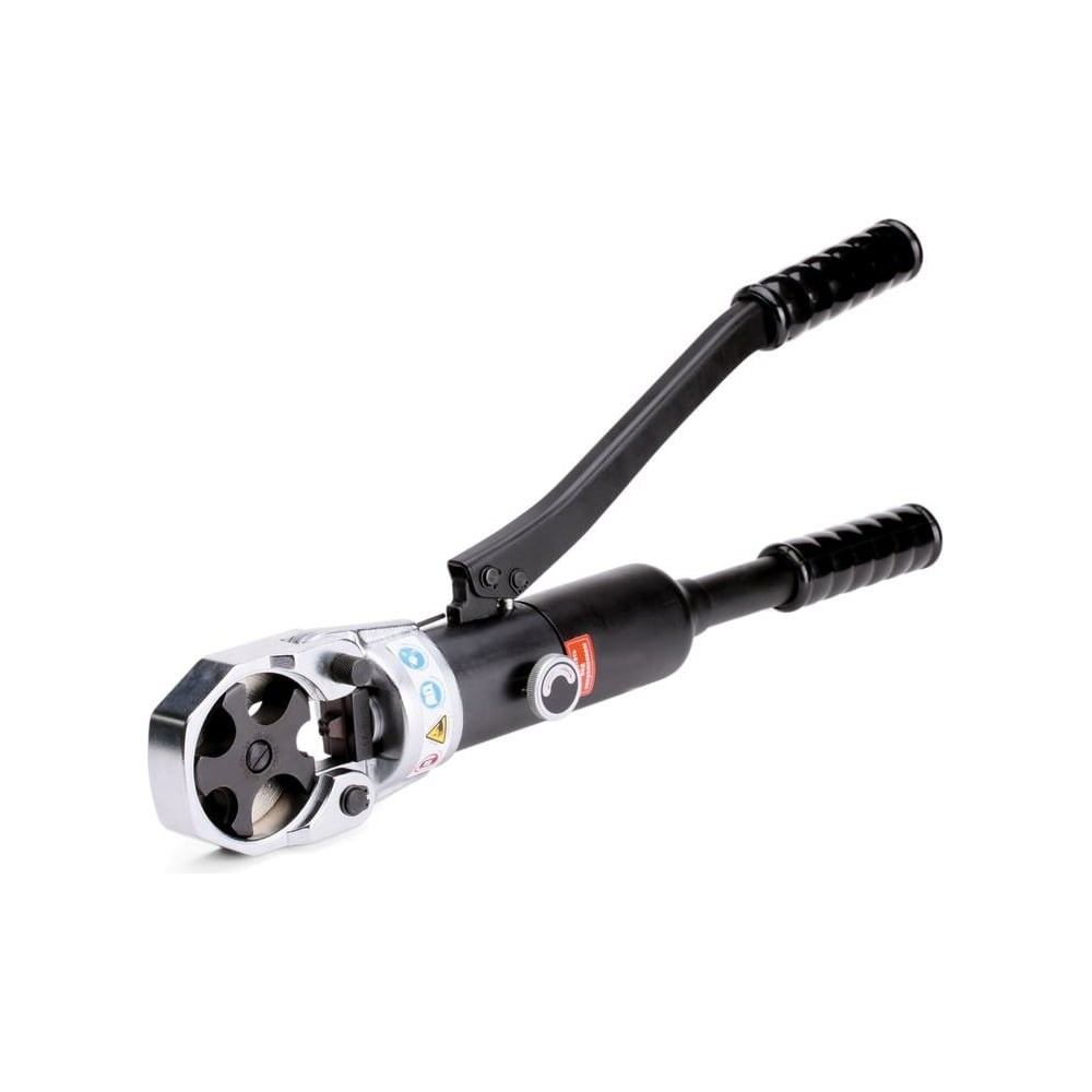 Гидравлический ручной пресс КВТ ПГРс-240 57759 Предназначен для опрессовки медных и алюминиевых неизолированных трубчатых наконечников Диапазон сечений: медные наконечники 10–185 мм2 алюминиевые наконечники 10–240 мм2 Клиновидный профиль обжима Встроенная вращающаяся револьверная матрица Механизм автоматического сброса давления (АСД) Клапан ручного сброса давления Двухскоростная помпа с механизмом быстрого хода поршня Клиновидный обжим гарантирует надежность и прочность контактных соединений «наконечник-жила» Максимальное усилие: 12 т Вес комплекта/инструмента: 6.30/4.50 кг