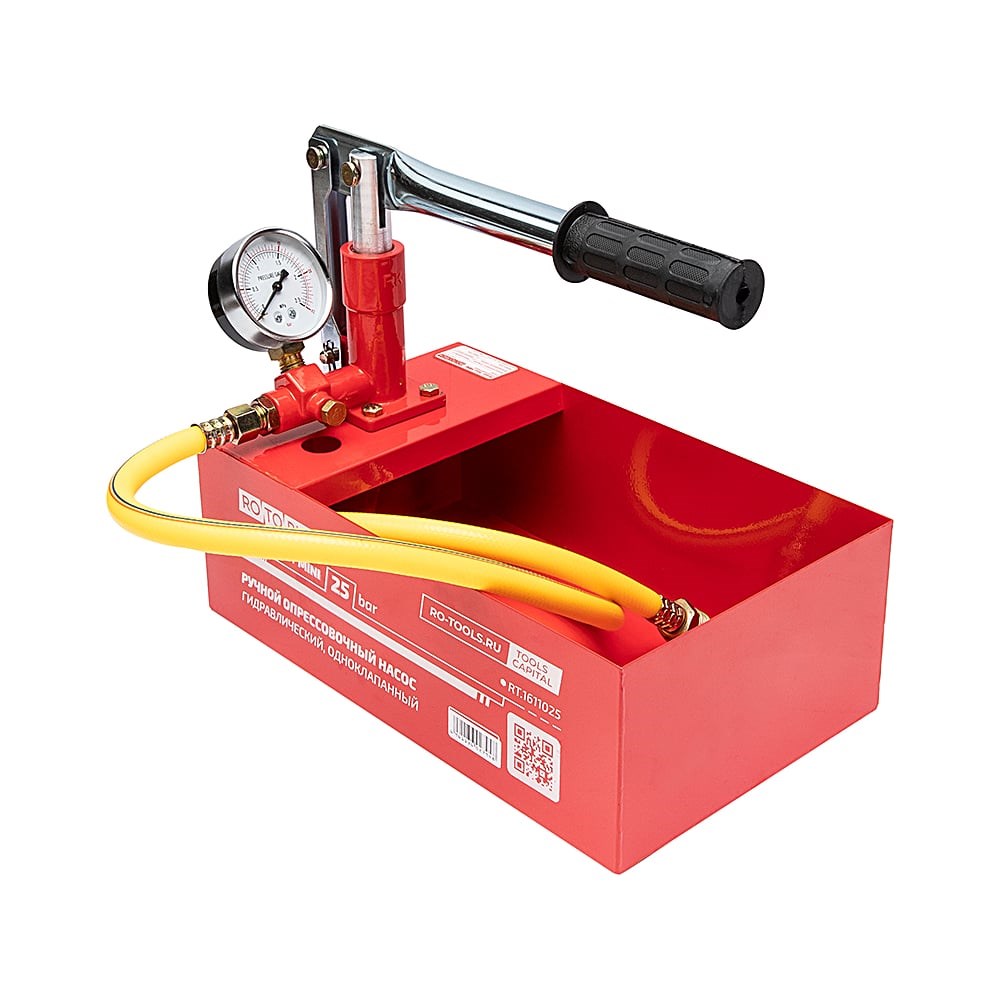 Ручной опрессовщик Rotorica ROTOR TEST MINI RT.1611025 - испытательный насос для проверки на герметичность различных гидросистем. Манометр позволяет быстро считывать показания. Рычаг имеет накладку для более комфортного применения.