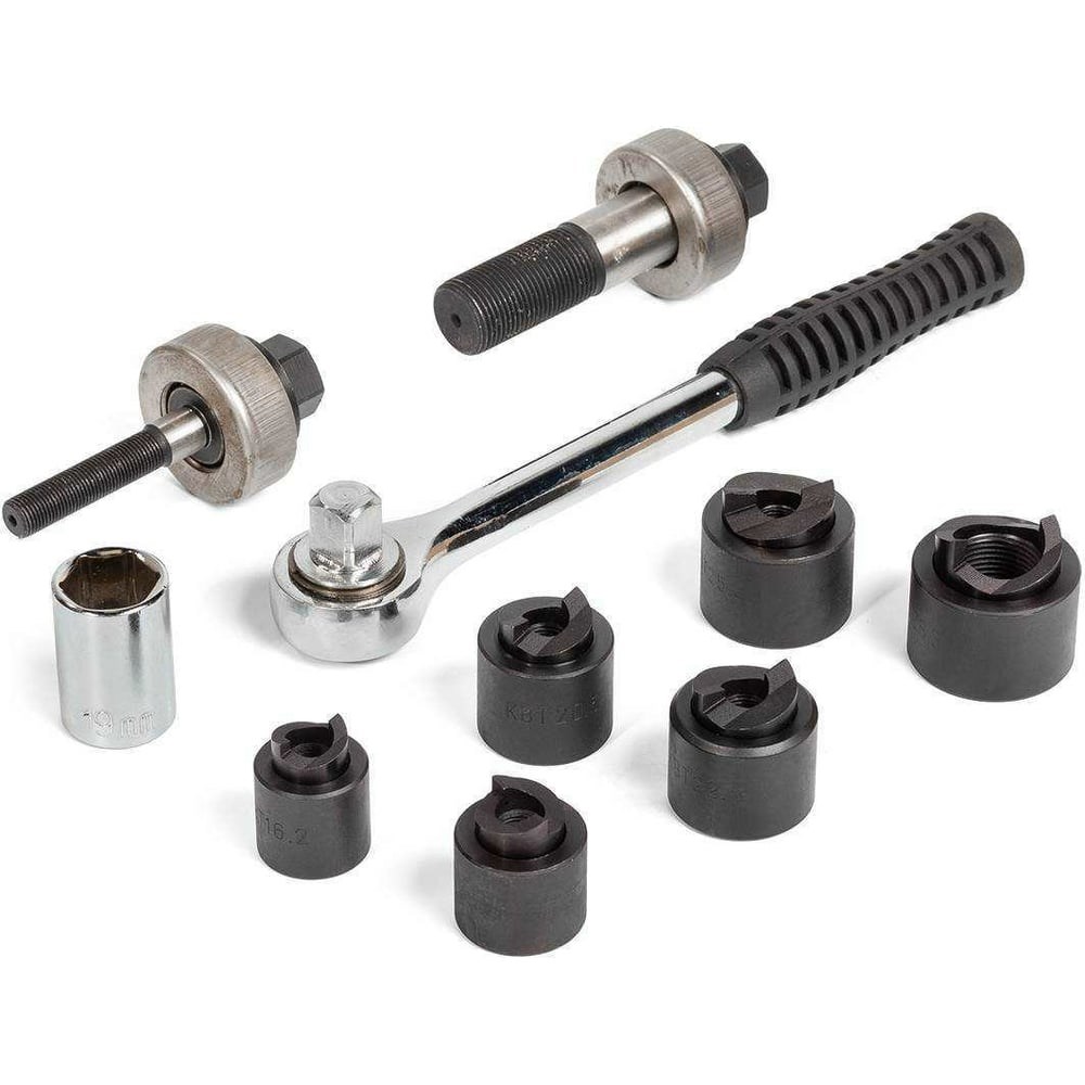 Ручной пресс для пробивки отверстий КВТ ПРПО-60 85440 представляет собой инструмент для пробивки отверстий в металлических листах при монтаже сборочных шкафов, щитков под кабельные вводы, приборы, кнопки, замки. Каждая перфоформа представлена парой матрица – пуансон специальной конструкции, которая позволяет разрезать кольцевой отход на две части во избежание застревания высечки внутри перфоформы. Инструмент поставляется в удобном пластиковом кейсе для рационального хранения и транспортировки. Дополнительные характеристики: Присоединительная резьба: 1/2" Вес комплекта: 2.3 кг Габариты кейса: 212х275х65 мм Рекомендованные матрицы: Круглые матрицы МПО Ø 15.2–64.0 мм Наборы матриц НМПО-PG, НМПО-MG