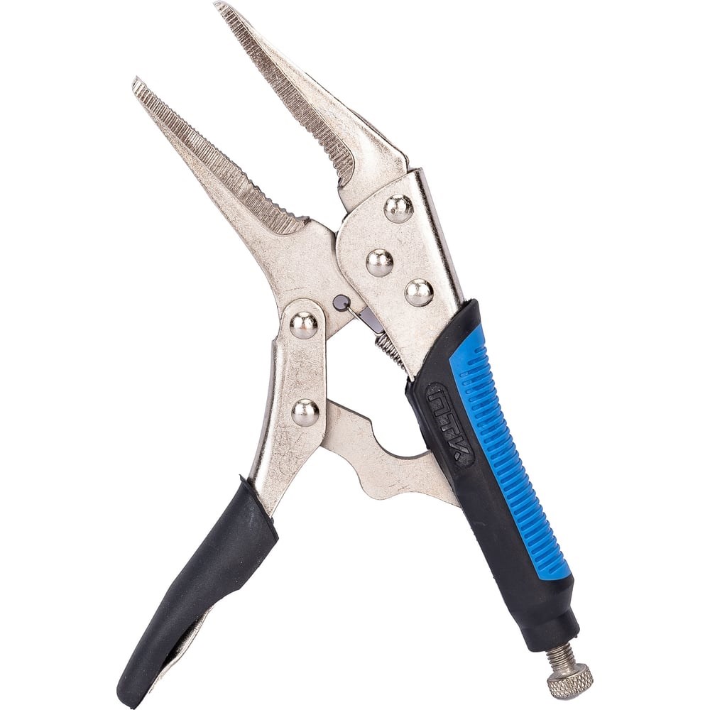 Ручной зажим с фиксатором ПТК РЗФ-9,0 Тип J 00000034432оснащен подвижными губками и винтом, который расположен на рукоятке и обеспечивает надежную фиксацию. Максимальный размер закрепляемой детали 43 мм. Зажим изготовлен из стали и имеет прочную конструкцию с высокой степенью твердости. Это значительно увеличивает срок эксплуатации изделия. Данная модель имеет изолированные ручки из термопластичной резины, которые обеспечивают надежный захват инструмента во время работы.