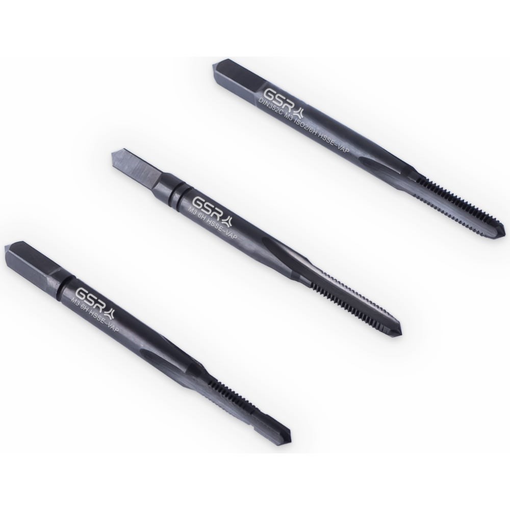 Ручные метчики GSR M3х0,5 HSSE-VAP DIN352 6H набор 3 шт B00813130 предназначен для нарезания метрической ISO-резьбы M и состоит из трёх метчиков - первый (черновой, с направляющей цапфой), средний (получистовой) и третий (чистовой). Метчики до М6 имеют утолщённый хвостовик и 3 канавки. Метчики от М7 имеют проходной хвостовик и 4 канавки. Материал обработки - высоколегированные стали, а также нержавеющие стали, стали INOX, V2a и стальное литье до 1400 Н/мм2 (44HRC). Первый (черновой метчик) маркирован одним кольцом, длинная заборная часть, с направляющей цапфой, Форма А / 6-8 витков. Средний (получистовой) маркирован двумя кольцами, средняя заборная часть, Форма D / 3,5-5 витков. Третий (чистовой) без маркировки, короткая заборная часть, Форма С / 2-3 витка. DIN 352 = Немецкий институт по стандартизации, M = размер в мм для метрических ISO2-резьб в соответствии с DIN 13, 6H = класс точности по DIN 802, часть 1, HSSE- VAP = быстрорежущая сталь группы сплавов HSS c содержанием кобальта. Метчики обработаны методом азотирования и вапоризации, Вид отверстия сквозное / глухое. Инструмент обработан методом азотирования. Азотирование — это процесс химико-термической обработки, при которой поверхность различных металлов или сплавов насыщают азотом в специальной азотирующей среде. Поверхностный слой резьбонарезного инструмента приобретает повышенную коррозионную стойкость и высочайшую микротвердость.