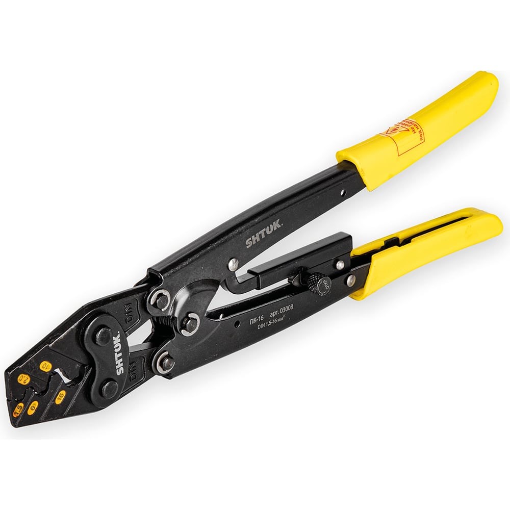 Ручные пресс-клещи SHTOK ПК-16 03008 представляют собой небольшой удобный инструмент, для работы с маленькими сечениями. Рассчитан на опрессовку наконечников площадью до 16 мм2. Диапазон сечений, мм2: 1-16; Профиль опрессовки: точка; Автоматический контроль опрессовки; Храповой механизм, с автоматической разблокировкой по завершении цикла опрессовки; Опрессовка в одно движение; Изготовлены из холоднокатанной углеродистой стали, что в 2 раза повышает ресурс работы по сравнению с аналогами, изготовленными из горячекатанной стали; Контроль геометрии матриц и самого инструмента для оптимального качества опрессовки; Пластиковые ручки из экологичного ПВС;